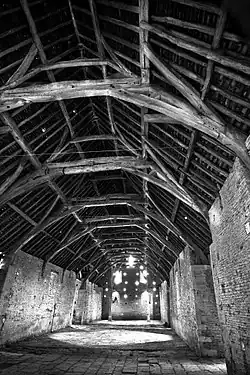 There is some uncertainty about when the barn was built. The National Trust describes it as 13th-century, whereas English Heritage describe it as 14th-century[1][2] The discrepancy may be the result of a radiocarbon date of around 1250 conflicting with evidence that the barn was built in 1376 by Abbot John Ombersley of Evesham Abbey.[3]