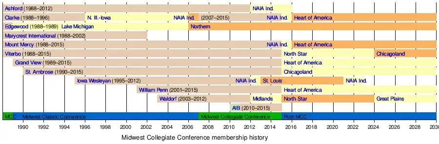 - 1988 – The Midwest Collegiate Conference (MCC) was founded as the Midwest Catholic Conference (MCC). Charter members included Clarke College (now Clarke University), Edgewood College, Marycrest University (later Marycrest International University), Mount Mercy College (now Mount Mercy University), Mount St. Clare College (later Ashford University) and Viterbo College (now Viterbo University), beginning the 1988–89 academic year.