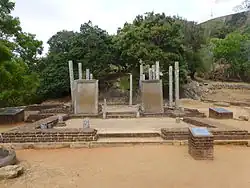 On either side of the entrance to a building, are 2 inscriptions engraved on 2 large slabs of granite known as the Mihintale stone inscriptions. The rules and regulations pertaining to the administrative purposes of the monastery are engraved on these 2 stone slabs. This inscription installed by King Mihindu (956 - 976 AD) contains records of payments made to the service staff. In the vicinity of another plain is the meeting hall of the monks. Here the monks met, to discuss the Dhamma and the Vinaya. This is an open building which is 62 feet (19 m) square and was constructed on 48 stone pillars. In the middle of the hall is a platform with 4 entrances.