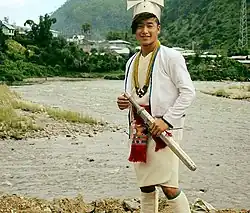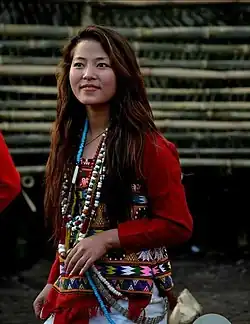 The traditional costume of Miji women consists of an ankle-length white garment with a beautifully decorated red jacket. Unlike the majority of other tribes of Arunachal Pradesh, India; the Miji people wear silver ornaments, and glass/brass based necklaces.[1] Indigenous cosmetics are made from pine resin and coal ( specially during marriage ceremonies). The traditional dress of Miji community constitute of (1)_Grii za (cotton cloth), (2)_ornamental beads, (3)_silver/Bamboo crown, (4)_Gichin thay ( long cotton cloth, red in colour, which serves as a belt), (5)_waichin ( sword ), (6)_Lai lo (cotton cloth to cover lower portion of legs), (7)_Lai Drangk (ornamental beads to keep Lai lo intact), and other ornaments including necklaces, bangles and ear tops.