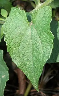 Mikania natalensis is a herbaceous,[1] vigorous perennial climber.[2][3] The leaves are opposite and well spaced.[3] The leaf stalk is up to 30 mm long.[3] The leaf blade is about 80 mm by 40 mm,[2] triangular, long-pointed, with pointed backward extensions.[3] The leaf margin is widely (and irregularly[3]) toothed.[2] There are five veins[1] in the leaf from the base.[2] The leaves are velvety grey beneath,[2] and thinly pubescent above.[1] Flowers are 10 mm long,[3] cream-coloured with purplish anthers[2] and white corollas;[3] in loosely branched inflorescences.[2][3] The flowers are heavily scented and produced from April through September.[2]