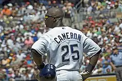 Cameron tied a major league record on May 2, 2002, when he hit four home runs in one game,[7][8] becoming only the 13th player in MLB history to do so. His first two home runs of the game both came in the first inning, each coming after a home run by teammate Bret Boone, making them the first teammates in history to hit back-to-back home runs twice in the same inning.[9] In Cameron's fifth at bat, he hit a line drive to the warning track, just missing what would have been a record-setting fifth home run. He played in the All-Star Game in 2001,[10] reached the postseason twice and won the Gold Glove Award in 2001 and 2003 for his defensive play in the outfield.[11] He led all major league center fielders in range factor (3.42) in 2003.[12]
