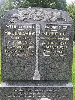 On Saturday 21 March 1981, Hailwood set off in his Rover SD1 with his children Michelle and David to collect some fish and chips. As they returned along the A435 Alcester Road through Portway, Warwickshire,[52] near their home in Tanworth-in-Arden, a lorry made an illegal turn through the barriers onto the central reservation, and their car collided with it. Michelle, aged nine, was killed instantly. Mike and David were taken to hospital, where Mike died two days later from severe internal injuries.[53] He was 40 years old. David survived with minor injuries. The lorry driver was fined £100.