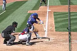 At the start of spring training in 2014, Olt reported that his vision problems had been resolved.[24] Olt competed for the starting third base job with the Cubs.[25] He made the Cubs' Opening Day roster, though Cubs' manager Rick Renteria suggested that Olt would split playing time at third base with Luis Valbuena.[26] Olt hit his first major league home run on April 3,[27] and his first grand slam on May 8.[28] Olt was demoted back to Iowa on July 23, 2014 after posting a .139 batting average for the 2014 season.[29] Twelve of his 31 hits were home runs by the time he was demoted, setting an all-time MLB season record for most home runs hit by a batter with an average below .170.[30]