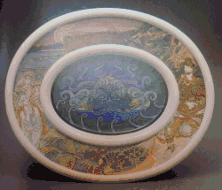 On July 20, 1890, the 22-year-old painter A. Mamontov died in the Abramtsevo Colony. As Mamontov's friend, Mikhail Vrubel attended the funeral. He became so fond of the local landscapes that decided to stay in there. In Abramtsevo, Vrubel became fascinated with ceramics and soon after that he proudly mentioned to his sister Anna that he now heads the "factory of ceramic tiles and terracotta decorations".[78] Savva Mamontov did not understand Vrubel' aesthetic aspirations but recognized his talent, and was trying his best to create a suitable living environment for the painter. For the first time in his life, Vrubel ceased to depend noble families for his support and started earning good money by completing several ceramic commissions; decorating a majolica chapel on the grave of A. Mamontov; projecting the extension in the "Roman-Byzantine style" to the Mamontov's mansion.[79] According to Dmitrieva, "Vrubel… seemed to be irreplaceable as he could easily do any art, except writing texts. Sculpture, mosaics, stained glass, maiolica, architectural masks, architectural projects, theatrical scenery, costumes – in all of these he felt inherently comfortable. His decorative and graphic idea poured forth like a broken water main – sirins, rusalkas, sea divas, knights, elves, flowers, dragonflies, etc. were done "stylishly", with an understanding of the characteristics of the material and the surroundings. His goal was to find the "pure and stylishly beautiful," that at the same time made its way into everyday life, and thereby to the heart of the public. Vrubel became one of the founders of the “Russian Art Nouveau" – the "new style" that added to the neo-Russian romanticism of the Mamontov's circle, and partially grew out of it."[80]