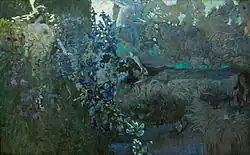 The multi-color picture turned out to be more ascetic than the monochrome illustrations.[70] The colours Vrubel uses have a brittle, crystal-like quality which emphasises the livelesness, sterility and coldness of the Demon reflected in the surrounding nature.[71] In the painting Vrubel has used his typical color palette of blues and purples, which reminds of Byzantine mosaics.[72] One of the characteristics of Vrubel's art is the glowing sparkling effect many of his paintings possess. This fits within the Byzantine tradition where such glowy and shiny effects of the mosaics were meant to express God's miraculous incarnation.[73] Vrubel's goals may not have been to express this particular thing, but it was to give his paintings a spiritual, otherworldly sensation. The painting's texture and colour emphasize the melancholic character of the Demon's nature that yearns for a living world. It is characteristic that the flowers surrounding it are cold crystals that reproduce fractures of rocks. Alienation of the Demon to the world is emphasized by "stone" clouds.[69] The opposition between the Demon's aliveness and strength and his inability/lack of desire to do something is represented by an emphasis on the Demon's muscular body and his interlocked fingers. These elements contrast with the helpless sentiments that are conveyed by his slumping body and the sadness in the Demon's face.[74] The figure may be strong and muscular on the outside, but it is passive and introverted in its posture.[75] The figure of the Demon is not depicted as an incarnation of the Devil, but as a human being that is torn apart by suffering.[76] ‘The Demon’ can be seen as a manifestation of Vrubel's long search for spiritual freedom. Despite Vrubel's own description, the Demon does not have wings, but there is their mirage formed by the contour of large inflorescences behind his shoulder and folded hair.[77] The painter returned to his image only in 8 years.[66]