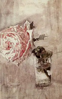 After graduating with a distinction, neither Vrubel nor his parents thought of his career as an artist. It was decided to send Mikhail to Saint Petersburg where he could study at the Saint Petersburg State University and live with his uncle Nicolai Vessel, who would also cover Vrubel's everyday expenses.[14] Mikhail's decision to study at the Faculty of Law was differently interpreted by Vrubel's biographers. For example, Alexandre Benois, who studied at the same faculty, suggested that the rationale behind this decision was the family tradition and values that legal profession had among their social circles. In 1876, Vrubel had to repeat the second year due to poor grades and a desire to strengthen his knowledge on the subjects. However, even though Mikhail studied for a year more than was expected, he could not defend his thesis and graduated in the rank of "deistvitel'nyi student" which was the lowest scientific degree that one can graduate with.[15] Despite deep engagement with philosophy and, particularly, the theory of aesthetics by Immanuel Kant, Mikhail's s bohemian lifestyle that his uncle allowed him to maintain was partly to blame for not finishing the university. At that time, Vrubel did not spend much time on practicing painting,[16] though he made several illustrations for literary works both classic and contemporary. According to Dmitrieva, "in general… Vrubel's art is thoroughly "literary": a rare work of his does not originate in a literary or theatrical source".[17] One of the most famous compositions from that period is "The date of Anna Karenina with the son". According to Domitieva, this was his "pre-Vrubel" stage since the painting mostly reminds of journal illustrations of that time: "utterly romantic, even melodramatic, and very carefully decorated".[18] Active participation in theatrical life (Vrubel personally knew Modest Mussorgsky who frequently visited the Vessel's house) required considerable expenses which is why Vrubel regularly worked as a tutor and a governess. In 1875, he even travelled to Europe with one of his pupils; together, they visited France, Switzerland and Germany. In addition, Mikhail spent the summer of 1875 at the estate that belonged to a Russian lawyer Dmitrii Berr (His wife Yulia Berr was a niece of Mikhail Glinka). Then, due to the excellent knowledge of Latin, Vrubel was hired as a tutor at the Papmel family where he guided his former university classmate.[19] According to the memoirs of A. I. Ivanov: