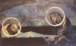 At the same time, Adrian Prakhov organized painting of the St Volodymyr's Cathedral and, without regard to his personal attitudes, invited Vrubel. Despite Vrubel's carelessness towards his works inspired by his "bohemian" lifestyle, he created no less than six versions of the "Tombstone Crying" (only four of them have been preserved). The story is not included in the Gospel and not usual for the Russian Orthodox art, but can be seen in some icons from the Italian Renaissance. Though he clearly understood their significance and originality, Prakhov rejected Vrubel's independent paintings since they differed significantly from the works of other participating colleagues and would have unbalanced the relative integrity of the already-assembled murals.[47] Prakhov once noted that the a new cathedral "in a very special style" would need to be built to accommodate Vrubel' paintings.[48]