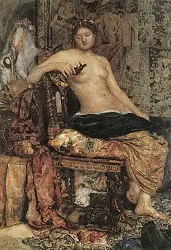 One of the brightest examples of Vrubel's academic work is his sketch "Feasting Romans". Even though it formally compiled with rules of academic art, the painting violates all the main canons of academism – the composition does not have the main focus, the plot is unclear.[28]