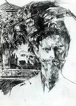 Vrubel's moving to Moscow was accidental, like many other things that happened in his life. Most likely, he travelled there because he fell in love with a circus horsewoman which he met thanks to Yasinsky's brother who performed under the pseudonym "Alexander Zemgano". As a result, Vrubel settled at the Korovin's studio on the Dolgorukovskaya street.[58] Vrubel, Korovin and Serov even had an idea to share a studio but, however, it did not translate into reality due to deteriorating relations with Serov. Later, Korovin introduced Vrubel to the famous patron of the arts Savva Mamontov.[59] In December, Vrubel moved to the Mamontov's house on the Sadovaya-Spasskaya street (outbuilding of the town estate of Savva Mamontov). According to Domiteeva, he was invited "not without attention to his skills as a governess".[60] However, relationship between Vrubel and the Mamontov family did not work out – patron's wife could not stand Vrubel and openly called him "a blasphemer and a drunkard". Soon painter moved to a rental apartment.[61]