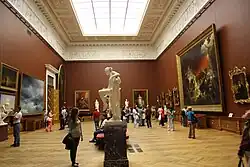 The Mikhailovsky Palace houses the main building of the Russian Museum and is used to display its collections of early artworks, and those from the eighteenth and nineteenth centuries.[8] Entrance and exits are through the lower floor, which contains the ticket offices, cloakrooms, shops, cafe, and other visitor facilities.[8] The Rossi wing, the former Freylinskiy wing, displays nineteenth century art, and examples of Russian folk art.[8] Twentieth century art and temporary exhibitions are displayed in the Benois wing.[8] The former Manezhny wing was demolished by Vasily Svinin, with a new building constructed between 1900 and 1911, which now houses the Russian Museum of Ethnography, initially the Russian Museum's department of ethnography, but established as a separate museum in 1934.[3] Between 2000 and 2002 the original decoration of the palace church was recreated.[2]