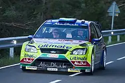 On 17 December, Hirvonen was officially named as the number one BP-Ford Abu Dhabi factory driver for the 2008 season, after Marcus Grönholm's retirement.[1] His young compatriot Jari-Matti Latvala was named his teammate in the second factory Focus.[1] Hirvonen started the season with a second place at the 2008 Monte Carlo Rally, which was his and the BP-Ford Team's target.[2][3] In Sweden, he was considered as favourite,[4] but had to settle for second being unable to keep up with his younger teammate's pace.[5] After Rally Mexico, where he had punctures and had to change a wheel, and in Rally Argentina, where he retired from the lead and then re-joined under SupeRally rules to take fifth place, Hirvonen took his first win of the season at the inaugural Jordan Rally.