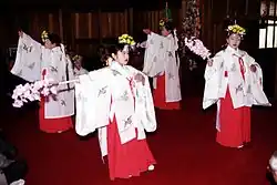 When a miko is serving a Shinto ritual or performing kagura (a shrine maiden dance), she wears a chihaya over the top.[13]