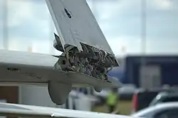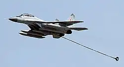 The MiG-29K is modified from the Mikoyan MiG-29M for naval operations.[4] The airframe and undercarriage are reinforced to withstand the stress experienced upon landing. Folding wings, an arrestor hook, and catapult attachments were added for carrier operations; the aircraft's undercarriage track was also widened. The MiG-29K, unlike the early MiG-29, can both conduct aerial refueling and "buddy" refuel other aircraft.