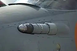 The MiG-29K has two widely spaced RD-33MKs. The early prototypes were fitted with two RD-33K turbofan engines, each with afterburner thrust of 86.3 kN (19,800 lb) and a possible take-off thrust of 92.2 kN (20,723 lbf) for shipborne operations.[31][32] The RD-33MK engine features 7% higher power over the base RD-33, enabled by the usage of improved materials for the turbine blades.[33][34]
