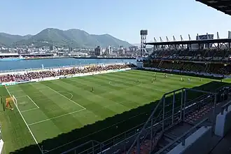 Mikuni World Stadium Kitakyushu (ミクニワールドスタジアム北九州), often known colloquially as Kitakyushu Stadium, is a stadium located in the city of Kitakyushu in Fukuoka Prefecture, Japan. The stadium was built between 2015 and 2017, being officially opened in February 2017. Construction for the stadium cost ¥9.9 billion (US$87.5 million), with the overall cost for the stadium site costing ¥11.5 billion (US$101.7 million). The stadium has an official capacity of 15,460. The stadium is situated on the northern coast of Kyushu island and oversees the Kanmon Straits, the stretch of water that sits between Kyushu and Honshu.