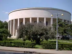 In late 2017, the city started works to remove trees surrounding the Meštrović Pavilion in the middle of the Square of the Victims of Fascism, prompting protests against the city administration led by a citizens' initiative named Vratite magnoliju ("Bring Back the Magnolia") after several old magnolias among many trees and bushes that the city intended to cut down, reducing the greenery around the Pavilion to a grass cover.[228][229][230] Bandić and another city official were prosecuted for damaging cultural heritage and other accusations regarding the square remodelling.[231] The trees, some of which were protected heritage and fixtures of Zagreb pop culture,[232] were removed while the process was ongoing by the city authorities; some of the trees were reportedly "diseased",[233] and some "grew too much",[232] while the project documentation was contradictory on the others.[234][235] The makeover also included removing Brač limestone steps and replacing them with concrete.[229] At the end of the process, Bandić was found not guilty, and subsequently taunted protestors by cutting grass on the square while dressed in the uniform of Zrinjevac, the city's park maintenance company, which caused them to demand his resignation.[236][237] The city administration also removed benches and placed signs forbidding walking on the green surfaces. While a few academics supported the square makeover, most were opposed, including architectural, landscaping and art history societies.[238] The makeover polarised the public, leading to "guerrilla" tree planting actions suppressed by the police, the result was that the citizens much less often frequented or stopped at the square.[239][240][241] The renewed square's "cold monumentality" has been compared to the architecture of totalitarian and fascist Independent State of Croatia, which had cleared part of the square in 1941–42 while converting the pavilion to a mosque.[242][243]