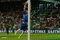 In his second season with the club, Borjan would help Red Star qualify for the 2018–19 UEFA Champions League, and would earn two clean sheets: once in the group stage opener against Napoli,[39] and again in a 2–0 home win against Liverpool.[40] In February 2019, Zvezdan Terzić announced that Borjan would sign a contract extension until 2023, and would finish his career after that. He was honoured by Red Star shortly after as the club athlete of the year.[41]