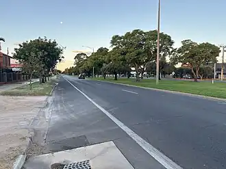 The central business district (CBD) is located at the northern end of the urban area, fronting onto the Murray River. The main shopping street of Mildura is Langtree Avenue, which features a pedestrian mall and shopping centre. The area between Seventh and Eight Streets is known as Feast Street, and is home to many boutique eateries and beverage dispensaries.[27] The combined (CBD) area, known as City Heart,[28] complements the Mildura Central Shopping Centre,[29] located at the opposite end of the urban area on the corner of Fifteenth Street and Deakin Avenue. The latter, so named after Alfred Deakin, 'the Victorian Cabinet Minister who introduced the concept of an irrigated settlement in Australia', itself runs around twelve kilometres in a south-west direction from Seventh Street before terminating in peri-urban farmland.[30] Fifteenth Street is the main strip of big box stores, car dealerships and other commercial enterprises.[31]