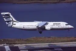 Aegean's first commercial flights were in May 1999 from Athens to Heraklion, Crete and Thessaloniki with two new wholly owned British Aerospace Avro RJ100.[19] In December 1999, Aegean acquired Air Greece.[19][20] Since 2005, the airline has been in partnership with Lufthansa.[19] In March 2006, Aegean Airlines also entered into a co-operation agreement with TAP Air Portugal.[19] In December 2008, Aegean Airlines announced its co-operation with Brussels Airlines.[21] In 2009, Aegean Airlines started codeshare agreements with BMI, Brussels Airlines, Lufthansa and TAP Air Portugal. On 26 May 2009, the Aegean Airlines' membership application was approved by the Chief Executive Board of Star Alliance. Aegean joined the alliance on 30 June 2010.