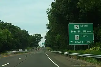 | 2.70 | 4.35 | 3B | Northern terminus; exit 54 on Merritt Parkway | ||||