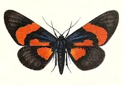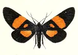 The upperside of the male is black, the forewings with a strong blue gloss at the nervules in the basal region. There is a broad, straight, orange-yellow median band which does not quite reach the anal angle, and with a small patch of the same colour behind the cell between the band and the base. The marginal fringe is white at the apex of the wing. The hindwings have a large discal patch standing closer to the base than to the outer margin, neither reaching the costal nor abdominal margin. The marginal fringe is white. The underside is the same as the upperside, but the markings are paler. Females differ from the males especially in the band of the forewings being narrower and curved, and in the patch on the forewings being extended along the inner margin towards the base.[2]