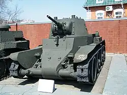 The museum's collection includes over 38,000 artifacts, stored in thirteen halls. The exhibition begins at the 17th century foundation of the Khabarovka military outpost by the 13th Siberian Battalion.[2] It extensively covers the events of the Russian Civil War in the Far East of the country and includes the train wagon used as headquarters by Vasily Blyukher which can be found in the museum's yard. Other conflicts covered in the museum are the Soviet–Japanese War, Damansky Island Incident, Soviet–Afghan War and the First Chechen War. The collection incorporates banners, paintings, dioramas, medals and decorations, pistols, rifles, uniforms, katanas and other melee weapons from both Russia and abroad. The museum's yard displays tanks, artillery pieces, trucks, naval mines and airplanes.[1]