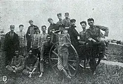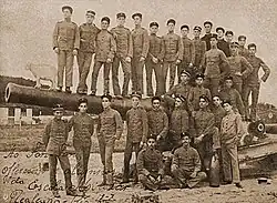 The teaching staff was made up of professors and instructors, respectively responsible for theoretical and practical content, in addition to adjuncts.[83] Students only started to be called cadets after 1931.[84] They were militarily organized into one or more student companies, which gave way to a Student Corps (later Cadet Corps) after 1918, with subunits of the four branches (infantry companies, grouped in a battalion, engineering company, artillery battery and cavalry squadron),[a] commanded by the instructors.[85]