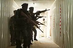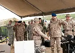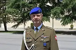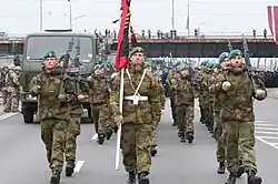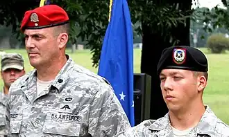 In all service branches, the beret is "bashed" to the right and a badge or insignia is worn above the left eye. In the army, all units can wear them with certain units wearing unique ones.[13] In the navy, the beret is an optional item[14] and in the air force, it is only worn by certain units.[15]