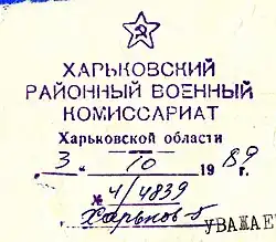 A military commissariat (Russian: Bоенный коммисариат, translit: voyenny kommisariat) was a local military administrative agency used in the Soviet Union to provide administrative and organisational military services. They were led by a military commissar (Russian: Bоенный коммисар, translit: voyenny kommisar) who worked in a political and bureaucratic role alongside a regional military commander who served as a traditional military official.[1] As is typical of Soviet phraseology, military commissariats can be referred to in Russian as 'voyenkomat' and military commissars can be referred to as 'voyenkom'; examples of Soviet portmanteaus.[2] Military commissariats were used in Soviet Russia and later Soviet Union from 1917 until the dissolution in 1991.[3] Soviet republics were divided into Krais and Oblasts and then into national districts and at each division a military commissariat was instated.[3] The role of the military commissariat at each stage of hierarchy differed; however, its core functions centred around administrative housekeeping regarding military personnel and military equipment and the provision of military training.[3] Other duties included troop mobilisation, forced conscription and punishments for draft dodging, preparing local men for service, registering all relevant weaponry including all machinery and cars in the region, delivering pensions to retired army personnel, and selecting and promoting officers.[3]