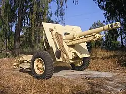 As a heavy artillery regiment, the 59th remained in England on coastal defence duties until 1944. In July, following the Normandy landings, the 59th crossed the English Channel and on July 6 disembarked at Courseulles-sur-Mer where the 3rd Canadian Infantry Division had landed a month before.[8] Once in France, the 59th served as part of the Army Group Royal Artillery of the British 21st Army Group. The unit first went into action supporting Battle for Caen, and later bombarded German forces in the Falaise Pocket. From there, the 59th participated in the major battles of the Western Front, including supporting the advance of XXX Corps during Operation Market Garden and in support of American forces during the Battle of the Bulge.[8] The 59th ended the war in Germany, firing its last shots against Hamburg on May 2, 1945.[6] During the North-West Europe campaign, the main guns of the 59th were the 7.2" Howitzer and the American-made 155mm "Long Tom".