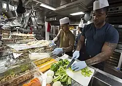 United States Navy culinary specialists preparing food in the galley of the USS Benfold (DDG-65)
