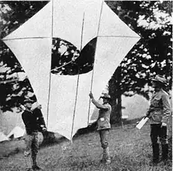 The first kite used by the United States Army Signal Corps specifically for raising an antenna was designed and built by Sergeant Thomas I. King, Signal Corps Company A, while stationed at Fort Leavenworth, Kansas, in 1905. The “King” kite was large, 7 feet high and 5 feet wide, made of 15 yards of white Japanese silk on a bamboo frame, and weighed less than 2 pounds.[2] Similar to Silas J. Conyne's kite of 1902,[3] it had a diamond shape with a squared-off top and bottom, keel, and large opening in the center to give it some of the stability of a box kite. It was used either singly or in trains of 2 to 4 kites or, on less windy days, in conjunction with a balloon to provide extra lift.