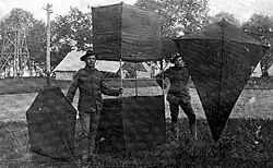 Some Signal Corps units conducted kite antenna experiments independently, often constructing their own kites. In June 1907 the First Company, Signal Corps, National Guard of New York, made box, Malay and hexagon shaped kites, to experiment with raising standard international code flag signals and radio antennae.[9]