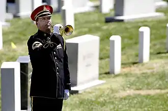 Military rites are honors presented at a funeral for a member of a military or police force. These rites, which are performed (usually) at the burial, include the firing of rifles, presenting of a flag and or bugle calls. In Australia and New Zealand a Poppy Service is often held for members of the Armed Forces.[1] This includes a short reading by a member of the Returned Services League of Australia[1] or, in New Zealand, the Returned Services Association, the laying of red poppies on the coffin by all present, the playing of the Last Post (or Taps in the United States), Reveille, and recitation of the Ode of Remembrance.