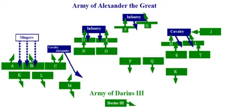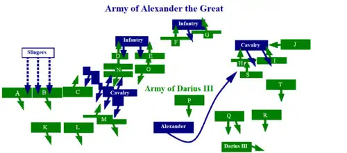 Alexander's plan worked: troops A, B, and C (letters arbitrarily assigned to allow for quick definition) blocked their way, thus creating a gap in the Persian army. Making a quick about-face, Alexander turned around to head for the gap. The slingers and lancers, hitherto covered by the right wing of the cavalry, were uncovered and carried out their mission. On the other fronts, the cavalry of the left wing and Alexander's infantry nevertheless resisted the onslaught of the Persian chariots on the Macedonian center.