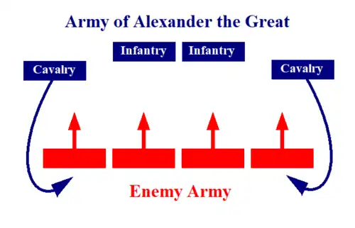 In order to drive the enemy forces away from their center, the Macedonian cavalry surrounded the flanks of the opposing army, systematically on the right flank which was commanded by Alexander himself, and then tried to make a gap and position themselves in the enemy lines, thus forcing their enemies to regroup.