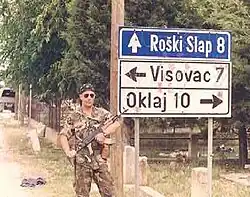 Before the UNPROFOR fully deployed, the HV clashed with an armed force of the RSK in the village of Nos Kalik, located in a pink zone near Šibenik, and captured the village at 4:45 p.m. on 2 March 1992. The JNA formed a battlegroup to counterattack the next day.[23] The JNA battlegroup, augmented by elements of the 9th Military Police Battalion, deployed at 5:50 a.m. and clashed with the HV force in Nos Kalik.[24] However, the JNA counterattack failed.[25] The HV captured 21 RSK troops in Nos Kalik, intent on exchanging the prisoners for Croats held under arrest in Knin.[26] Following negotiations, the HV agreed to pull back on 11 April, but later declined to do so, claiming deteriorating security at the battlefield in general prevented the withdrawal.[27] Several Serb-owned houses in Nos Kalik were torched after the HV captured the village.[28]