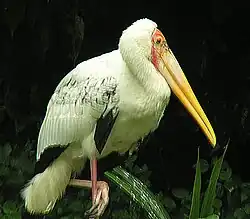 The adult is readily recognisable in the field by its white head feathers, yellow-orange bill, and pink legs.[9] It is distinguished from other waders such as egrets and lesser adjutants by its extensively white body plumage and black wing coverts.[10] However, the milky stork resembles and may therefore be confused with the partly sympatric Asian Openbill and various white egret species.[4] Nevertheless, the egrets are smaller and completely white, and the Asian Openbill is also smaller and distinguished from the milky stork by the grey bill.[4] In the northern part of its range around Vietnam, milky storks occasionally occur in sympatry with the closely related and morphologically similar painted storks.[4] However, the painted stork is distinguished from the milky stork in adult plumage by the former's black and white breast band and wing coverts, pink inner secondaries, more restricted bare head skin, and generally brighter soft part colouration.[1][4]