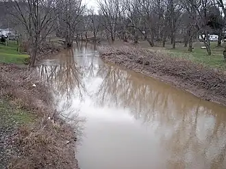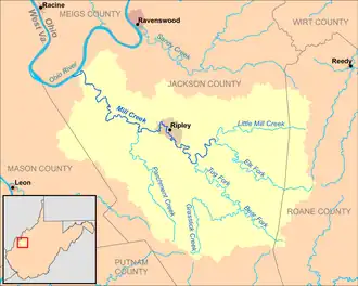 Mill Creek flows generally west-northwestward in a winding course through central and western Jackson County, through the city of Ripley, which may have been named for Harry Ripley, a traveling preacher said to have drowned in the creek in 1830.[9] Downstream of Ripley, the stream passes through a broad valley in the vicinity of the community of Cottageville[10] and flows into the Ohio River at the community of Millwood.[7] Approximately the lowermost 6 miles (9.7 km) of the stream consists of backwater caused by damming of the Ohio.[10] A commercial port facility is located on the creek near its mouth, handling limestone, sand, gravel, aluminum, and salt.[11]