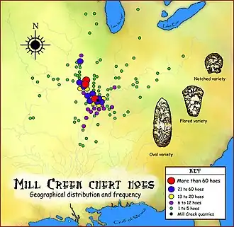 At the turn of the 20th century, archaeologists began realizing that in the hilly lands of Southern Illinois was the location for the quarrying and production centers—one of the greatest in prehistoric North America for this type of stone.[2] The sites were located near Mill Creek, Illinois, a village in Union County, located between Jonesboro and Cairo on the Alexander County line.[3] From this collection of sites, known colloquially as the "Indian Diggings", Native Americans quarried, worked into tools and blanks, and exported this stone to the wider Mississippian world. The chert found here was one of the major exported raw materials of the Mississippian culture and its distribution and procurement was one of the largest mining and production efforts organized during the Mississippian period.[2] The raw material was dug up in the quarries and then transported to small hamlets for production in hoes, spades and blanks. Archaeologists believe they were then transported to and traded at regional mound centers such as the Hale Site, a palisaded village with a platform mound and a burial mound. From these local sites, they were then transported and traded at sites even further afield. These materials were some of the most widely exchanged items during this period,[2] with especially large amounts transported to the American Bottom region. Examples are numerous at Cahokia, where it was especially prized for hoes and spades,[1] but finds have been made in locations as distant as Spiro and Moundville.