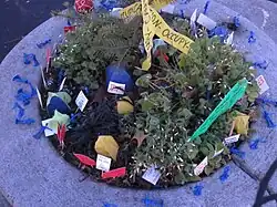 The small circle has featured many unusual items through the decades, including a swimming pool for butterflies—complete with diving board—a horseshoe, a fragment of the Journal building, and a miniature Ferris wheel, which was delivered by a full-size crane.[10] On St. Patrick's Day, 2001, the park was visited by a tiny leprechaun leaning against his pot of gold and children's drawings of four-leaf clovers and leprechauns.[2] The park continues to be the site of St. Patrick's Day festivities. The events held here include concerts by Clan Macleay Pipe Band, picnics, and rose plantings by the Junior Rose Festival Court.[6]