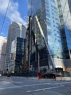 The developer blames the sinking problem on the Transbay Joint Powers Authority (TJPA), who were responsible for construction of the neighboring Transbay Transit Center (TTC).[30] The sinking problem had reportedly started before TTC construction even broke ground,[29] and TJPA asserted the building had already settled 10 inches (25 cm), well past the original maximum vertical settling prediction of 5.5 inches (14 cm) in 20 years, by the time TJPA began removing the timber piles under the prior Transbay Terminal in 2011.[36] The building's homeowners association, represented by general counsel Adrian Adams of Adams Stirling PLC, retained Dan Petrocelli of O’Melveny & Myers, to sue Webcor, Millennium Partners, and the TJPA.[37] Originally, the homeowners association hired David Casselman to sue the TJPA instead of developer Millennium Partners, as Casselman noted that "inverse condemnation law allows residents to collect legal fees on top of any award, whereas suing the developer will steer up to 40 percent of any award to lawyers".[30][23]