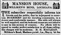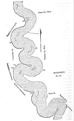 The settlement and the bend in the river were named for Major John Milliken.[2] According to one source, Milliken was "an early settler supposed to have been a member of the pirate band of Captain Bunch" that gave its name to Bunch's Bend (or Bunches Bend).[3] According to a family history, "He studied surveying when a young man, and going to Kentucky with others of the family found employment under the State government, and was rewarded by a grant of land in Louisiana, where he cleared a large and valuable plantation, which was called Milliken's Bend, it being on a loop of the Mississippi River. He owned many slaves, and acquired wealth."[4] Milliken is believed to have made his settlement slightly after 1813.[5] He eventually owned a vast area between Morancy Plantation and Cabin Teele Plantation.[6] Millikin's Settlement was present on Mississippi River guide books intended for use by boat pilots as early as 1827.[7] There is a record in the Madison Parish registers for a slave sale from L. Hyland to John Milliken on July 13, 1832.[8]