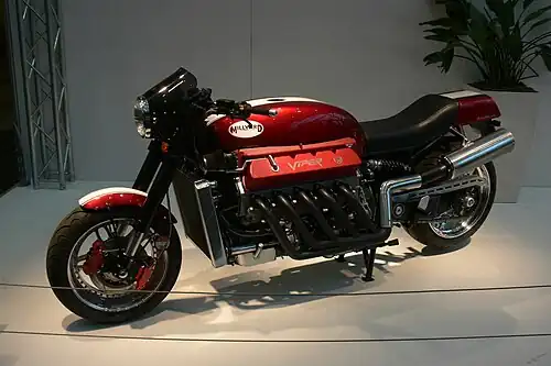 The Millyard Viper V10 is a one-off motorcycle capable of over 200 mph (320 km/h)[1] that was built by British engineer Allen Millyard. The motorcycle weighs 1,200 lb (540 kg), of which 700 lb (320 kg) is the 8-litre engine,[2] sourced from eBay, originally intended for a Dodge Viper, with the V10 cylinder configuration producing 500 bhp (370 kW) at 4,800rpm.[3]