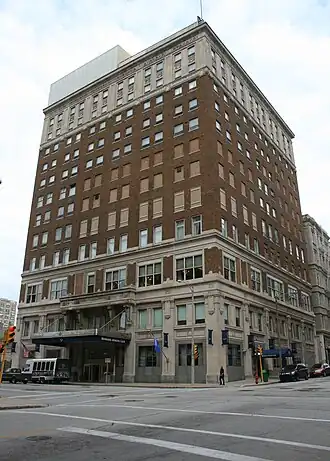In 1954, the club performed a nine-year restoration. In that year the club constructed the 13-story building, designed by Armand Koch with its exterior in Neoclassical style, resembling a column with the bottom three stories (the column's base) sheathed in stone veneer, the middle stories plain brick, and the top two in stone veneer - the column's capital. Beneath the veneer is a steel skeleton.[3] In 1954 a renovation of the interior was designed by Eschweiler & Eschweiler, adding the Bali Room, the Men's Lounge, and the Elephant Room.[4]