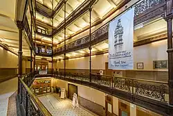 The interior features a 20-by-70-foot (6.1 m × 21.3 m) open atrium, which rises eight stories tall and is topped by a skylight.[9]