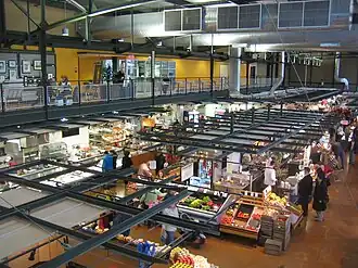 Typical food offerings include bakery items, meats, produce, seafood, soup, cheese, spices, wine, coffee, and candies. When the market opened in 2005, it focused primarily on selling raw ingredients, but over time, organizers found that vendors were more successful selling freshly prepared foods.[1] Other vendors offer flowers, gifts, and apparel. The market also includes community space for events.