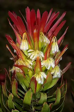 The flower heads are grouped in cylindric aggregations in the axils of the higher leaves of the stems. The bracts that subtend each flower head are either small and woody, or enlarged, bright in colour, papery or fleshy. The individual flower heads contain three to thirty-five flowers, relatively few compared to many other Proteaceae genera. This, and the sometimes bright coloration of the leaves and bracts in the inflorescence, result in the flower head functioning more or less as a single flower. Three types of flower head are distinguished: brush, tube and gullet. The flower heads of most species are of the brush-type. Flower heads of the brush-type have large perianths, pollen presenters and often bracts in bright and contrasting yellow, white or red. The subtending leaves do not differ from other leaves and remain green throughout flowering. In the tube-type flower heads, that only occurs in M. pauciflora, the number of flowers per head is reduced down to three (rarely four), and the involucral bracts are short. The bright yellow bracteoles of the three flowers together form a long, straight and narrow tube, from which only the perianth limbs and pollen presenters extend. The tube-type flower head functions comparable to tube-shaped corollas, such as in the large-flowered Erica species. The gullet-type flower head uniquely occurs in M. cucullatus and M. fimbriifolius. It functions in the same way as Acanthus and many Scrophulariaceae and Lamiaceae flowers. The bracts at the side of the stem are smaller, those in sight from the side are enlarged, while the leaf that is subtending the flower head above forms a brightly coloured hood. When the flowers open, the styles grow longer, break free from the perianth, and are pressed in the overhead leaf.[1]