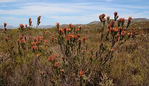 Mimetes capitulatus is an evergreen, upright, rounded shrub of about 2 m (7 ft) high, from the family Proteaceae. It has greyish green, lance- to egg-shaped leaves ending in a thickened tip. The flower heads and subtending leaves form a cylindric inflorescence, topped by ordinary, more or less upright leaves. Each primarily orange flowerhead contains 10–13 flowers with conspicuously scarlet styles, yellow under the narrow hourglass-like pollen presenter at its tip. Flowers can usually be found from mid-June till December, peaking in August. It is called conical pagoda in English and skraalstompie in Afrikaans.[2][3]